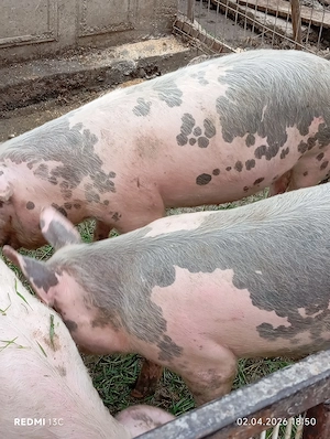 Vând 2 porci în jur la 150 de kg bucata, rasa pietran cu landrace, preț 10 lei kg.