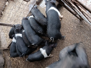 Vând purcei pietrean belgian de la două scroafe sunt in total 19 bucăți, rasă pură. La cerere ofer transport contra cost. Se pot vedea si părinții lor.