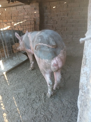 vier pietrain belgian, aprox 180 kg, ținut la regim pt a putea monta natural.