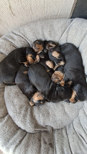 Cățeluși Teckel negru cu pete de foc, fetițe și băieți. Detalii la telefon.