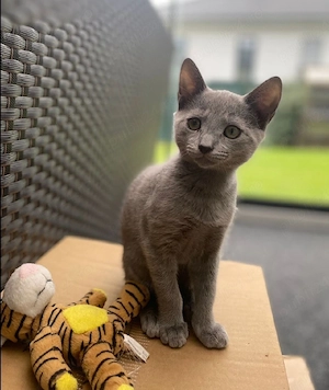 Pui de pisică din rasa albastru de rusia, blană scurtă, două pisicuțe și doi motănei, dețin ambii părinți, detalii la telefon.