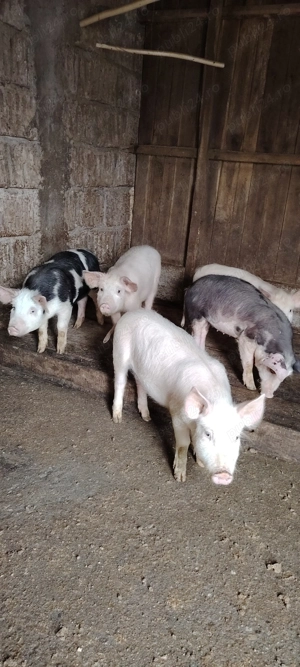 Vând purcei cu greutate cuprinsă între 40-70 kg și porci pentru sacrificat începând de la 90-130 kg.Porcii sunt rasă de carne și sunt crescuți în gospodărie cu cereale.